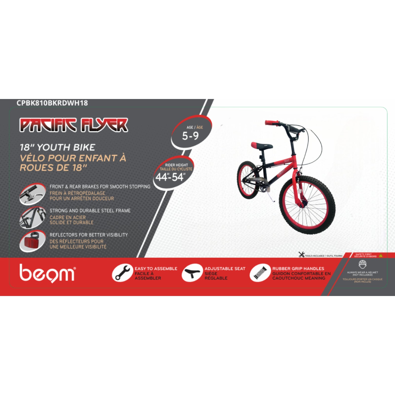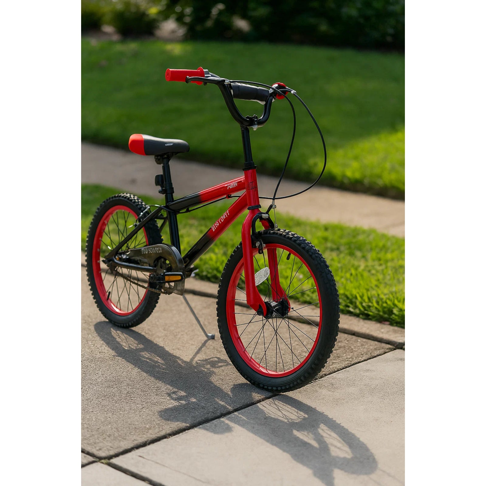 The Beam Sports BMX Styled 18" Bike is built for young riders ages 5–9, perfectly sized for heights between 44"–54". Finished in bold red with classic BMX styling, it’s designed for both style and safety. This bike features a responsive front hand brake, a sturdy kickstand, and padded handlebars for added comfort and protection. An adjustable seat height allows it to grow with your child, while a Semi chain guard keeps clothing and fingers safe. Front and rear Reflectors improve visibility. With its cool looks and safety-focused design, the Beam Sports BMX Styled 18" Bike delivers the perfect blend of performance and style. Quick and hassle-free assembly (tools included).