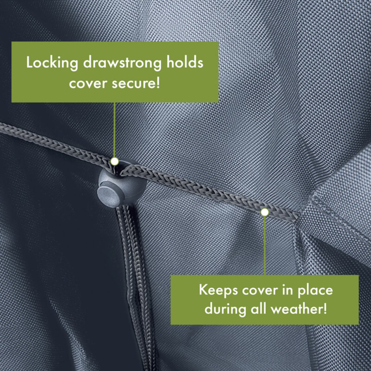 Protect your grill from the elements! Dual-sided vents dissipate excess heat and prevent condensation. Easy-Access resealable flab allows for quick access to the fuel tank. Snapping lock wheel fasteners anchor the cover even in strong wind. Adjustable drawstrings help to ensure a secure fit. Dual-sided sturdy grip handles for easy removal of cover.