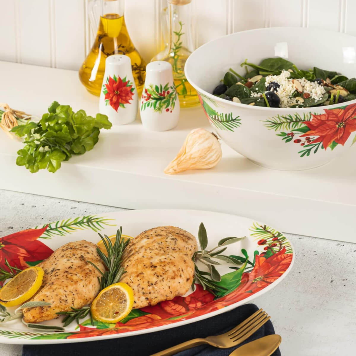 Start holiday celebrations that form traditions and memories to be cherished for a lifetime. The Magic Poinsettia 4-piece Fine Ceramic Serving and Accessories Set from Gibson Home is a collection of elegant serveware and tabletop accessories for beautiful, elevated place settings. Perfect for holiday dinner parties or everyday celebrations, this set is crafted from fine ceramic with a glossy finish for dependable durability. Festive foliage patterns decorate each piece to set a visual feast and leave lasting impressions. Each platter and bowl offers a generous capacity to hold and serve any culinary centerpiece - from the main course and holiday roasts to salads and desserts. Extend the holiday cheer by using these pieces all year round when dining and enterrtaining at home. Add this classic Christmas collection to your wishlist or wedding registry or give it as a gift to family and friends. Dishwasher and microwave safe.