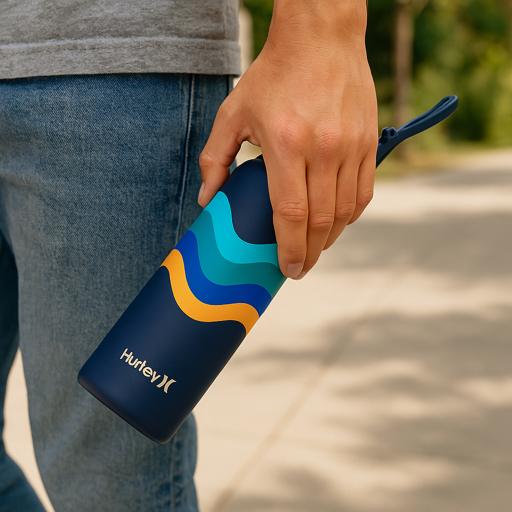 Ride the hydration wave with the Hurley Navy Wave 32 oz Stainless Steel Bottle with Chug Cap! Featuring a sleek navy finish and bold, colorful wave graphics, this bottle brings cool coastal vibes wherever you go. The chug cap makes for easy, quick sipping, while the double-wall insulation keeps your drinks cold and refreshing all day. Perfect for the gym, beach, or daily commute—stay fueled and stylish with Hurley.