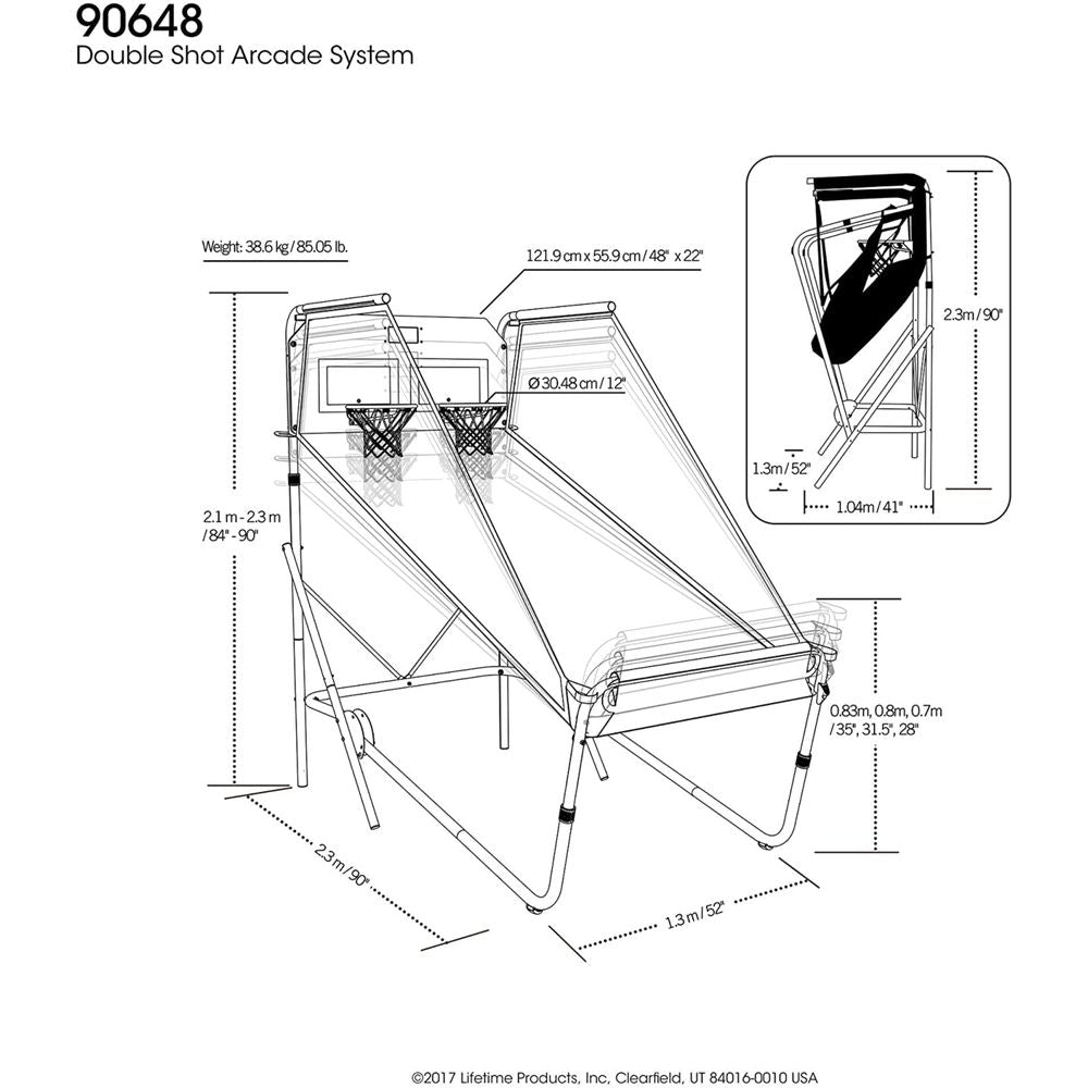 The Lifetime Double Shot is a fun activity for the whole family to enjoy. The frame has a rust-resistant finish, folds for storage, and uses push pins to adjust the front and back height, making it customizable for your home. The upgraded digital scoreboard keeps accurate score and uses a standard AC outlet or (4) AA batteries, allowing you to move the system to the perfect place in your home. The (6) 7 in. basketballs come with a pump and provide lots of fun for several players at a time. Play alone or in a group using the push button controller that is programmed with (12) new games (4 single-player, 4 two-player, and 4 multi-player games). Bring the Lifetime Double Shot home for years of fun!