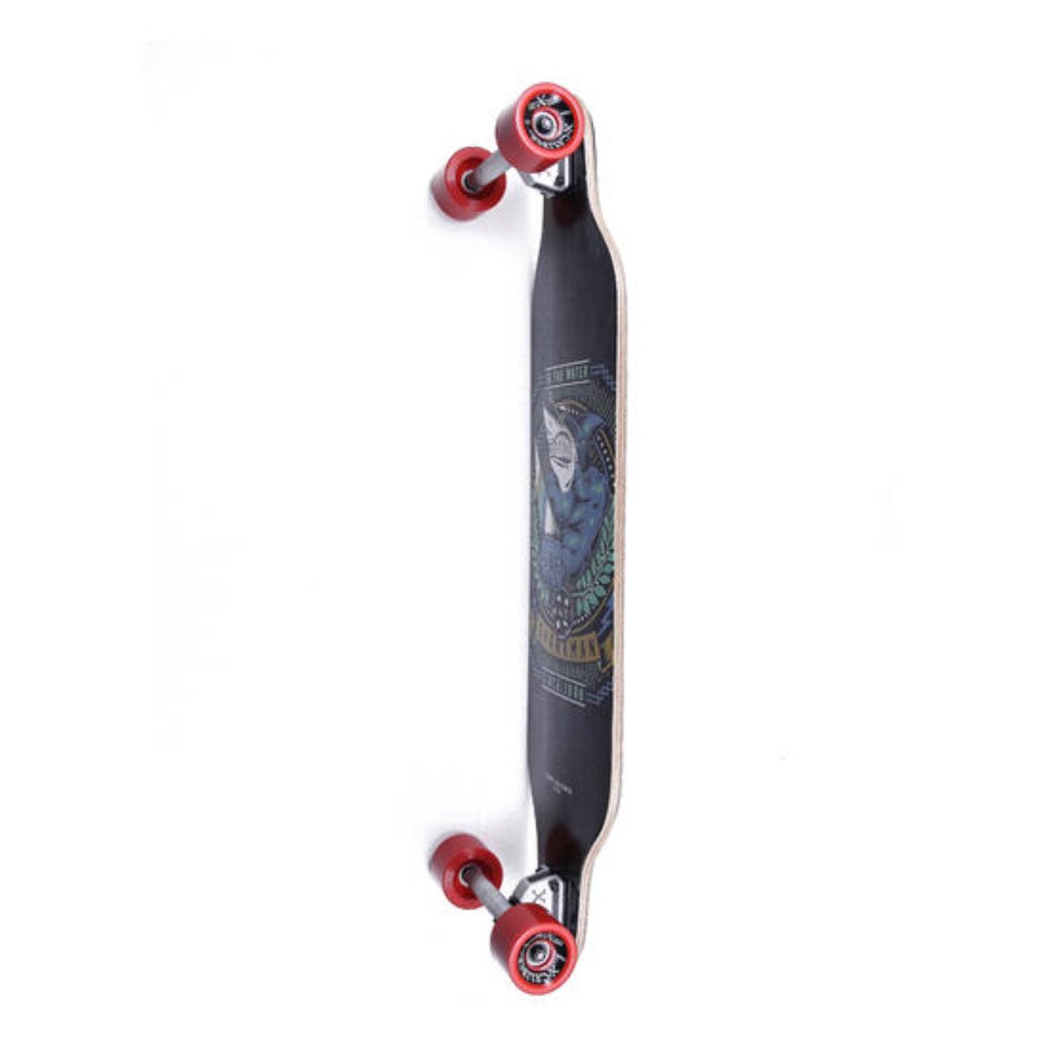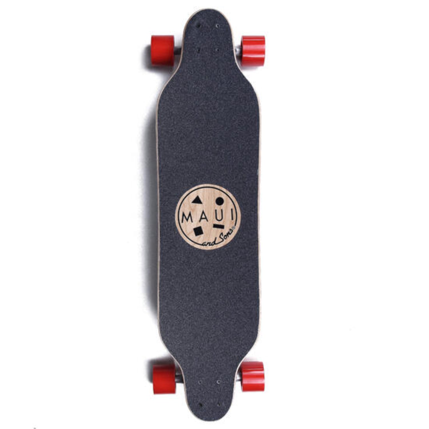 The Maui and Sons Drop Through board is the premiere cruising machine. Being closer to the ground, this board allows for a much more stable and comfortable ride than the traditional longboard design. With deluxe flexibility, subtle kick tail and dropped-through trucks the Maui and Sons Drop Through board is excellent for carving, dancing, freestyle, downhill, and cruising through the neighborhood.