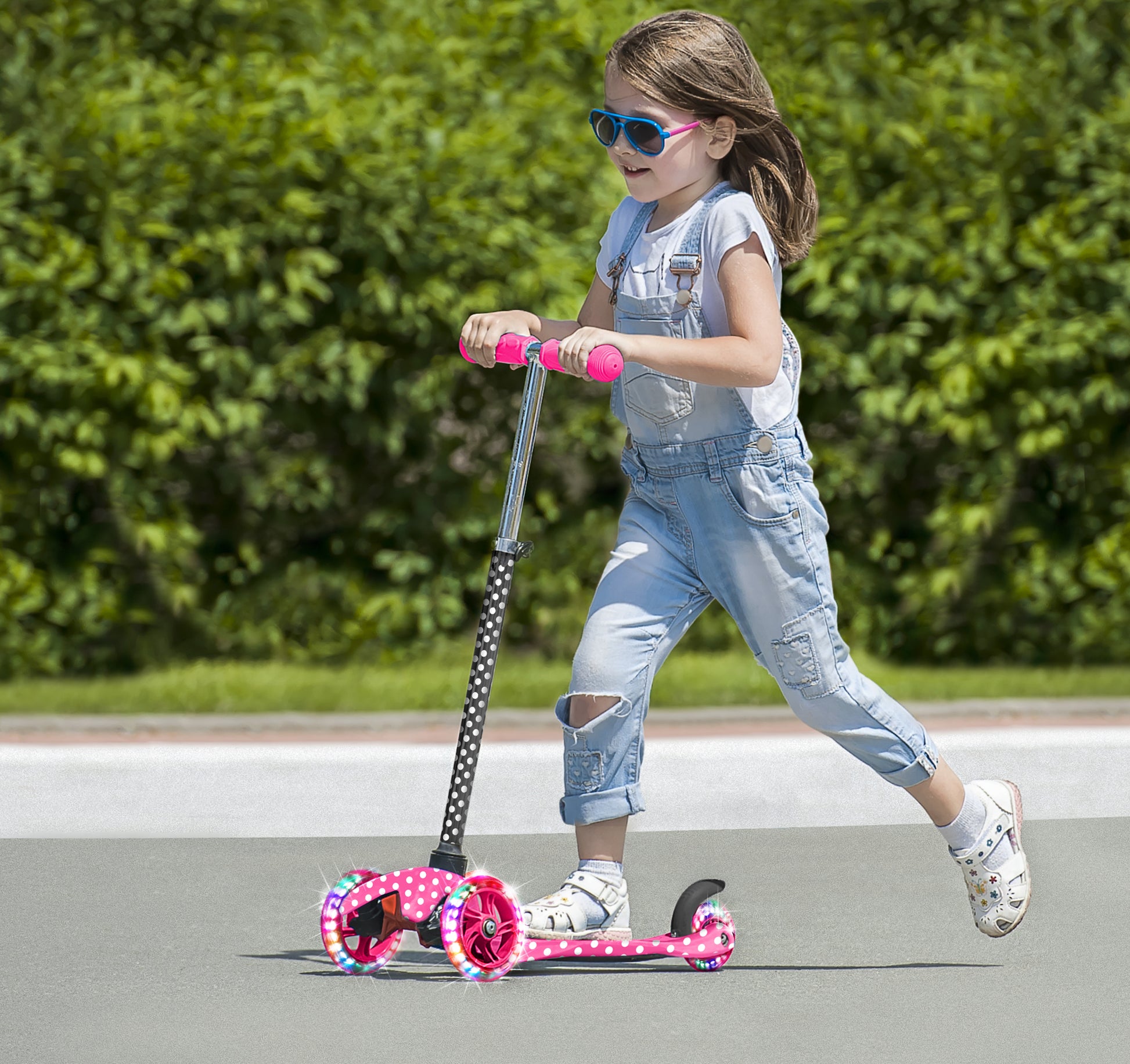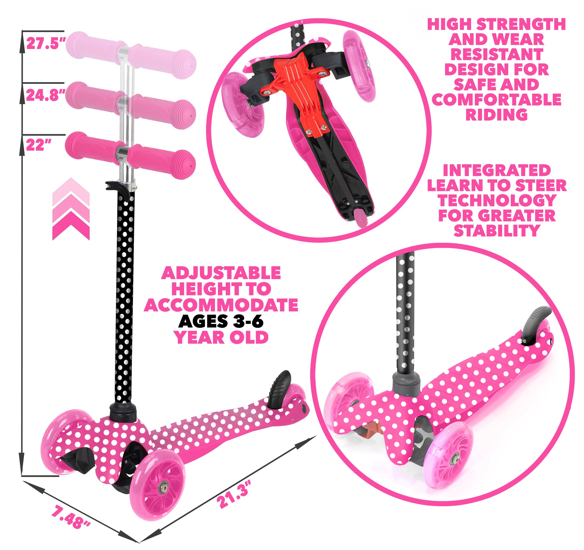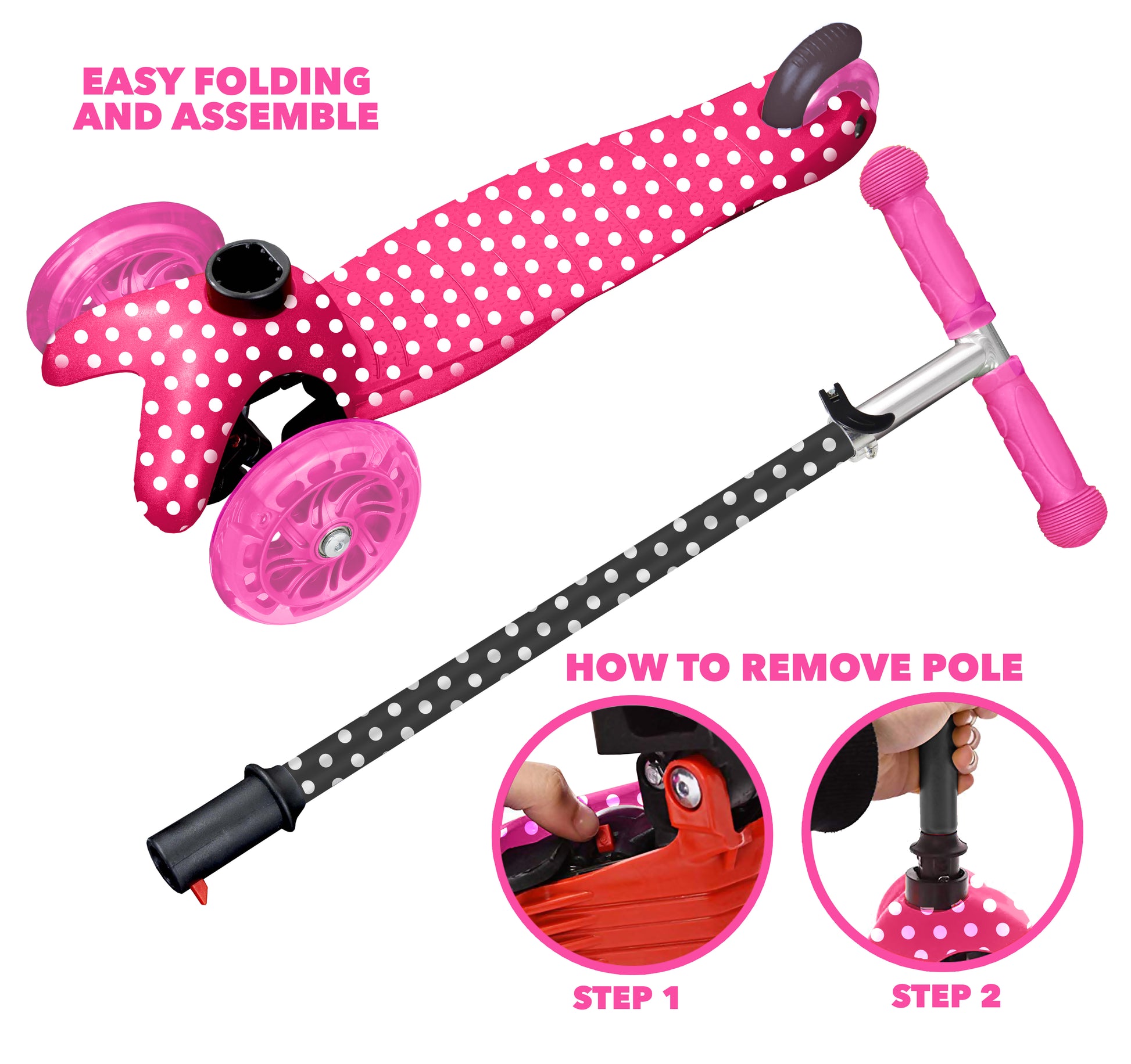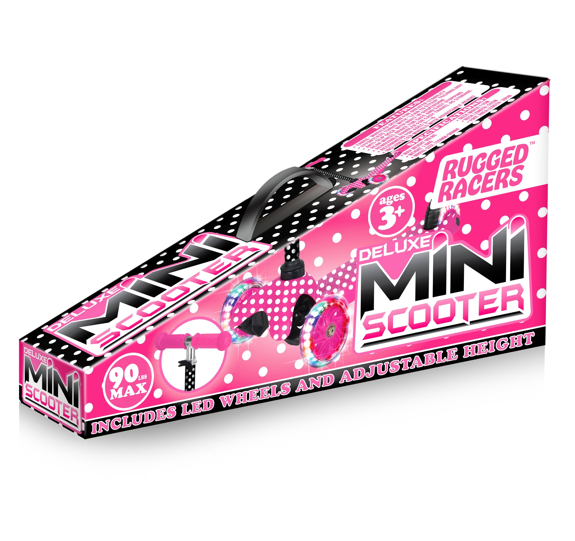 Rugged Racer Mini Deluxe 3-Wheel Scooter with LED Lights and Pink Polka Dot Design