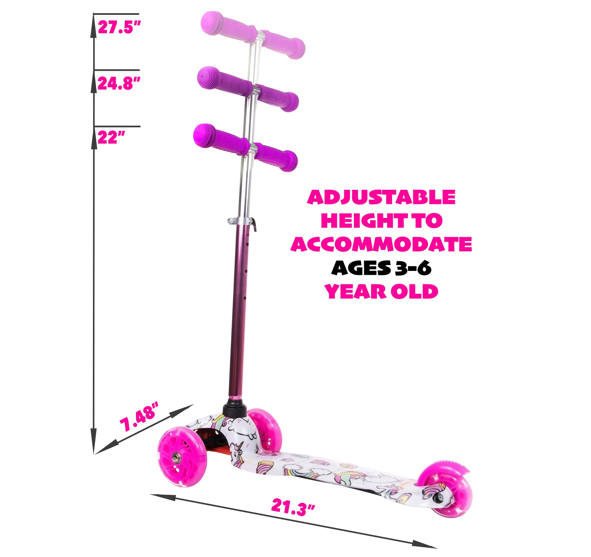 This 3-wheeled kick scooter by Rugged Riders, is perfect for introducing your child to the exciting world of outdoor sports and scooting. It has an adjustable handle that allows you to adjust the height as your child grows and makes it suitable for kids up to ages 7. Designed and engineered with first timers in mind, it’s learn-to-steer mechanical system makes scooting easy by steering in the direction that the child shifts its weight towards. Be the coolest kid at the park with its motion activated LED lights that are embedded in the wheels, making this scooter not only functional, but stylish as well. The standing deck is designed with an extra wide neck, large enough to fit both feet, making your child feel safe as they learn to ride. Its easy-store collapsible system makes this scooter simple to take in the car and stowaway when longer in use.