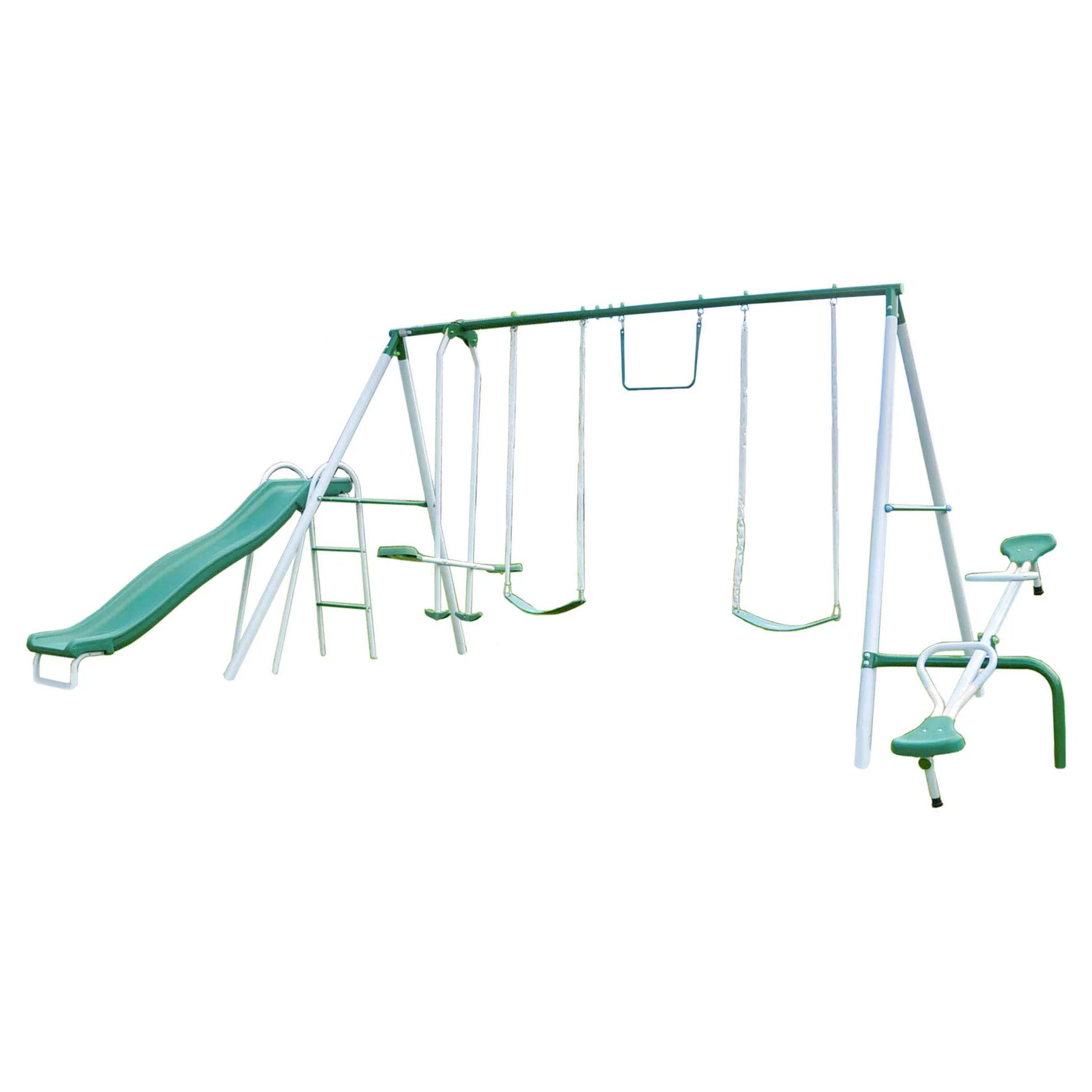 Spread the fun with the Live Oak metal swing set! With two blow-molded swings, a wavy slide, a trapeze with handle, a glide ride and teeter-totter, this swing set is sure to become an outdoor favorite with kids. Give your kids continuous active fun with the many activities this swing set has to offer!