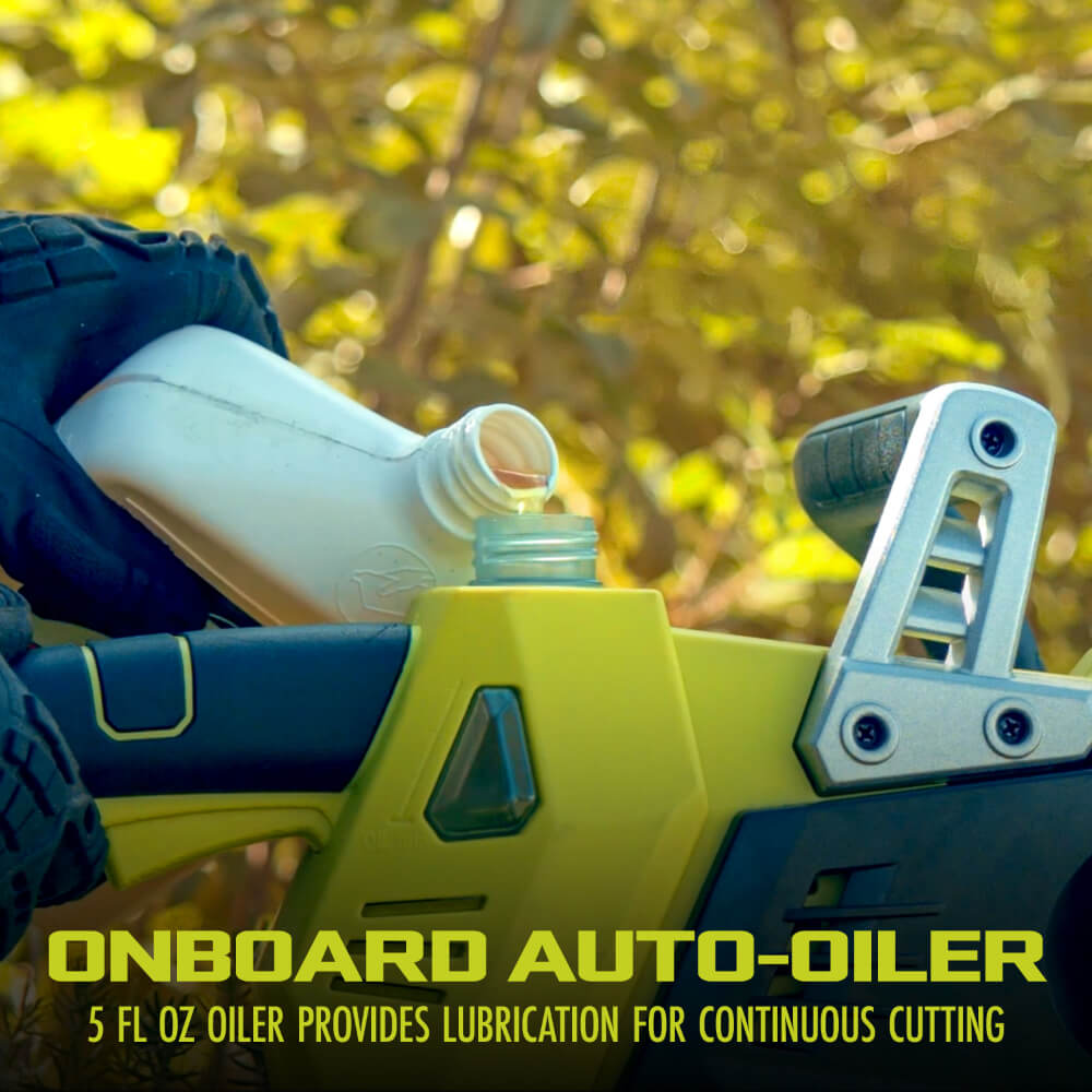 Cut The Cord and go beyond the limits of the extension cord, or anywhere power is at a premium. SUN JOE is powered by the two IONMAX 24-Volt* 2.0 Ah batteries. The robust 1,200 Watt motor and self-lubricating 16-inch bar and chain cut cleanly through branches and logs up to 15.5” thick, to quickly clear away brush and branches. The onboard, 5 fl oz oiler keeps the bar and chain fully lubricated for continuous cutting, and the tool-less chain tensioner provides a quick fix on-the-go with just a twist.