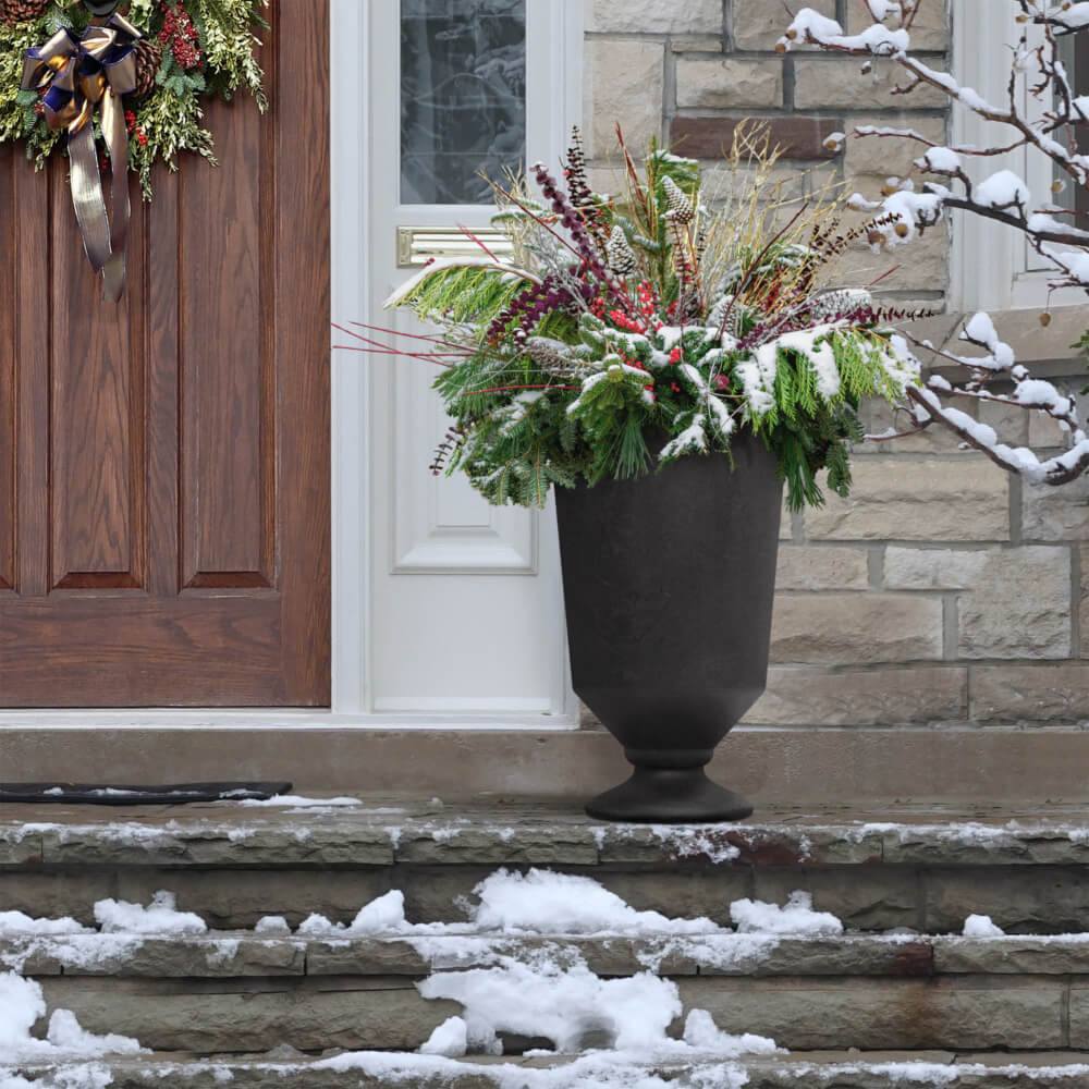 The Tierra Verde 14in W x 23in H Vibrato Modern Urn Recycled Self-Watering Indoor/Outdoor Large Planter in Black is an elegant and eco-friendly choice for any outdoor living space, patio, or indoor area. Crafted from recycled material, this sleek planter is designed to withstand the elements, offering durability for all seasons. Featuring a raised insert that creates an interior self-watering system, it ensures plants stay hydrated with ease. The water reservoir at the base allows plant roots to stretch down into the water, providing nourishment and promoting healthy growth. When used outside, a plug on the bottom may be removed to drain excess water. Ideal for busy plant owners, especially those who travel, this feature keeps your plants well-maintained with minimal effort. Tierra Verde planters are tested in -40 to +40 degree weather, ensuring that it is suitable for year-round use. Perfect for a variety of plants, this Tierra Verde planter brings both practicality and sophistication to your space. Made locally in North America