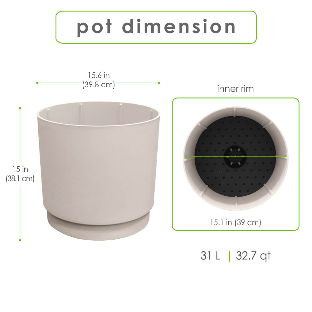 The Tierra Verde 15-inch W x 15-inch H Alto Modern Round Planter is an elegant and eco-friendly choice for any outdoor living space, patio, or indoor area. Crafted from recycled material, this sleek planter is designed to withstand the elements, offering durability for all seasons. Featuring a raised insert that creates an interior self-watering system, it ensures plants stay hydrated with ease. The water reservoir at the base allows plant roots to stretch down into the water, providing nourishment and promoting healthy growth. When used outside, a plug on the bottom may be removed to drain excess water. Ideal for busy plant owners, especially those who travel, this feature keeps your plants well-maintained with minimal effort. Tierra Verde planters are tested in -40 to +40 degree weather, ensuring that it is suitable for year-round use. Perfect for a variety of plants, the Tierra Verde Alto planter brings both practicality and sophistication to your space. Made locally in North America