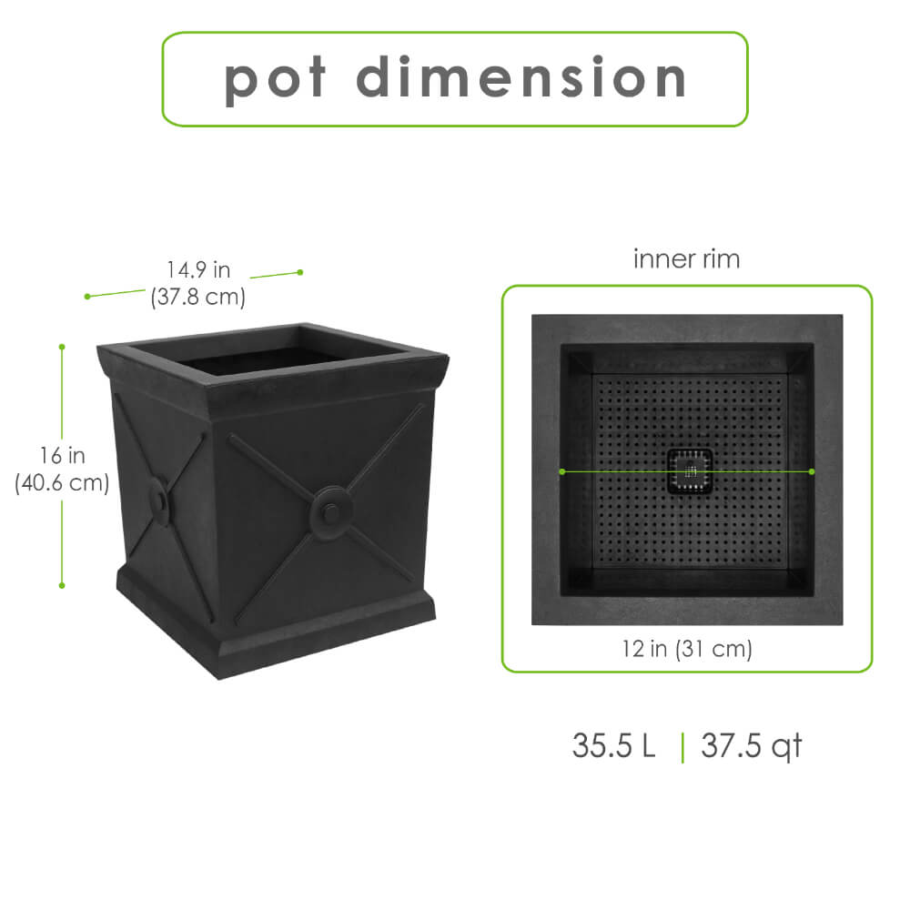 Tierra Verde 15" W x 16" H Allegro Monarch Square Self-Watering Planter - Black, Indoor/Outdoor